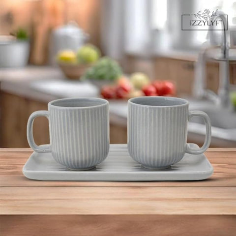 Package Contents: 2 Pieces of Coffee / Tea Mugs & 1 Tray. Perfect Dimensions: Cup (7.5W x 9H cm) and tray (24.5L x 13W cm) sizes ensure comfort and functionality for an enjoyable beverage experience....